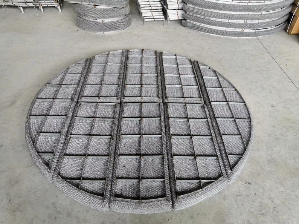 絲網(wǎng)除沫器主要是由絲網(wǎng)、絲網(wǎng)格柵組成絲網(wǎng)塊和固定絲網(wǎng)塊的支承裝置構(gòu)成,絲網(wǎng)為各種材質(zhì)的氣液過濾網(wǎng),氣液過濾網(wǎng)是由金屬絲或非金屬絲組成。氣液過濾網(wǎng)的非金屬絲由多股非金屬纖維捻制而成,亦可為單股非金屬絲。該絲網(wǎng)除沫器不但能濾除懸浮于氣流中的較大液沫,而且能濾除較小和微小液沫,廣泛應(yīng)用于化工、石油、塔器制造、壓力容器等行業(yè)中的氣液分離裝置中。