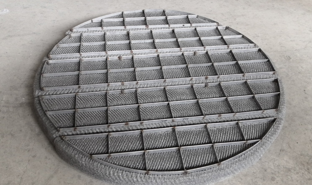 絲網(wǎng)除沫器主要是由絲網(wǎng)、絲網(wǎng)格柵組成絲網(wǎng)塊和固定絲網(wǎng)塊的支承裝置構成,絲網(wǎng)為各種材質的氣液過濾網(wǎng),氣液過濾網(wǎng)是由金屬絲或非金屬絲組成。氣液過濾網(wǎng)的非金屬絲由多股非金屬纖維捻制而成,亦可為單股非金屬絲。該絲網(wǎng)除沫器不但能濾除懸浮于氣流中的較大液沫,而且能濾除較小和微小液沫,廣泛應用于化工、石油、塔器制造、壓力容器等行業(yè)中的氣液分離裝置中。